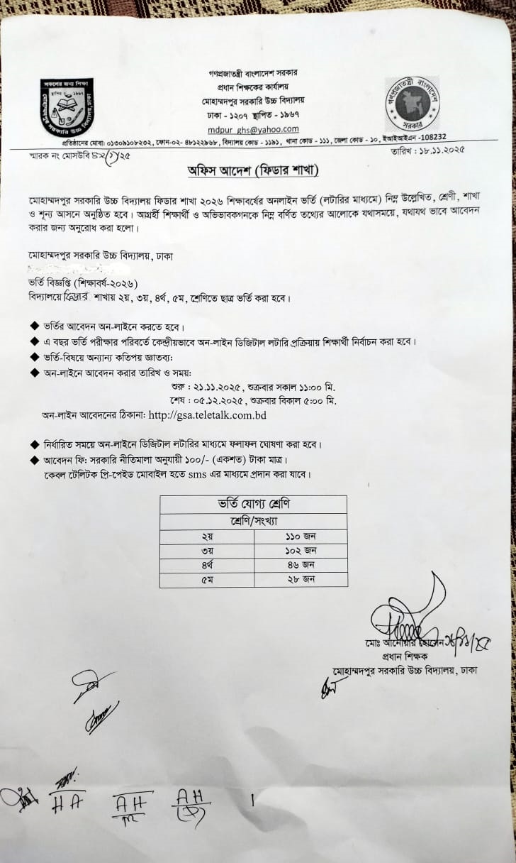 ফিডার শাখায় ভর্তি বিজ্ঞপ্তি( শিক্ষাবর্ষ - ২০২৬)